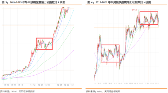 反例是2019-2021年的牛市,这轮慢牛与前几轮有两点明显的区别,第一是震荡期格外长,牛中段、牛尾部的两段均持续接近一年,与“牛市平台期”的定义或许有一定出入;第二是行业表现呈现分化,2021/2/19-2021/12/1的牛尾段“超过1个月的横盘震荡”前的主升并不是普涨行情,所以后面震荡时主升领涨行业也分化,一部分延续强势还有一部分被洗牌。