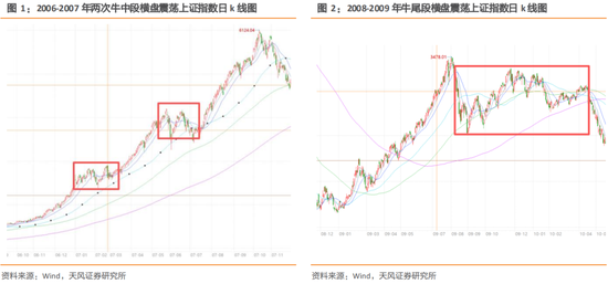 复盘上证指数历史走势,符合上述规律的样本有两种情况,一种是在两段牛市主升之间作为过渡,另一种是在牛市尾声,横盘震荡后确认下跌趋势。2006-2007、2008-2009、2014-2015的三轮牛市,无论较长期的横盘震荡发生在牛中段还是牛尾段,均存在两点共性规律:
