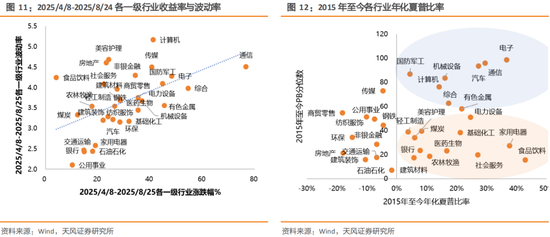 回到本轮牛市,今年4月8日-8月24日的这波主升中,各一级行业的收益率和波动率同样呈正比。牛市横盘震荡期,除了硬扛牛市主线的高波动,也可关注具备估值保护且前期低波动的行业。